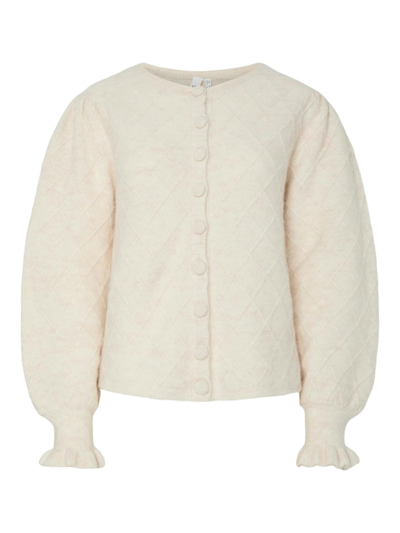Nydelig cardigan fra YAS med stofftrukket knapper, frill på ermer of puff på skuldre.