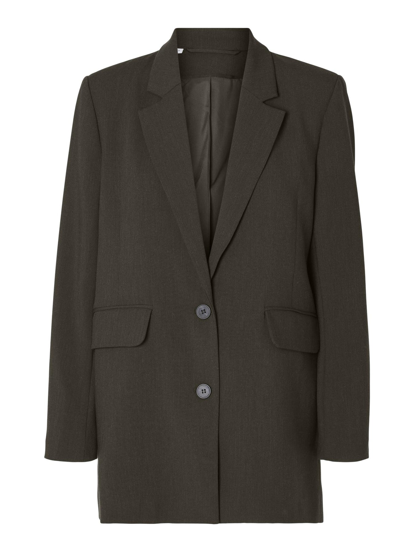 En oversized blazer fra Selected Femme med maskulint snitt og rett fasong. Lukkes med to knapper og har to klaffelommer. Jakken er fôret og har splitt bak.