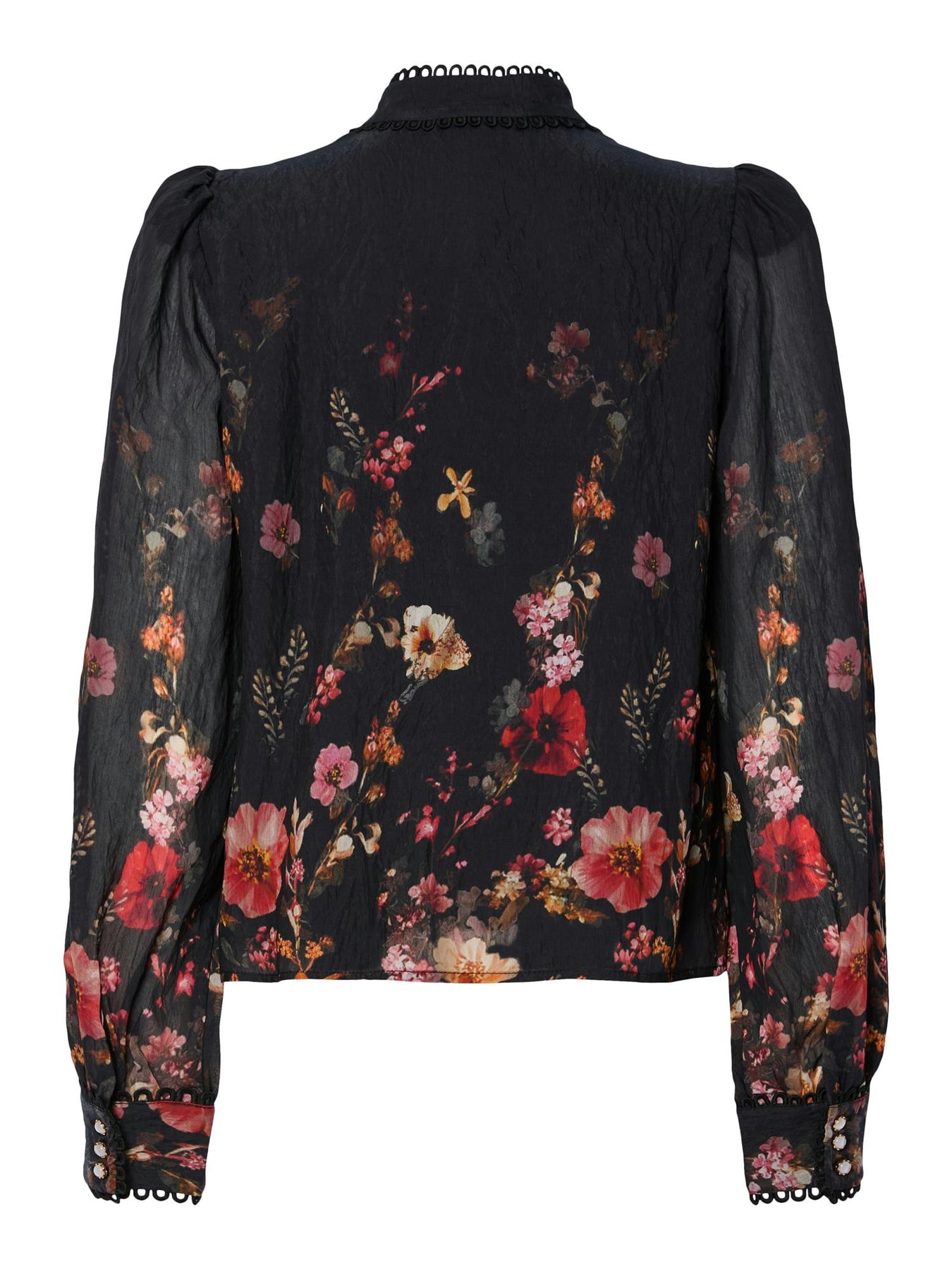 Lekker blomstrete bluse fra YAS. Den er laget av et viskosestoff som er pustende og faller lett mot kroppen. Lekre blondedetaljer på halskant og mansjetter. Lukkes med knapper i front.