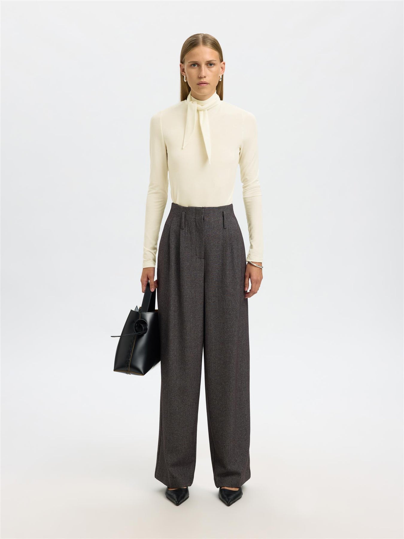 Topp fra Selected Femme med knyttebånd i halsen, lange ermer, slim fit passform. Toppen er i en tynn lyocell kvalietet.